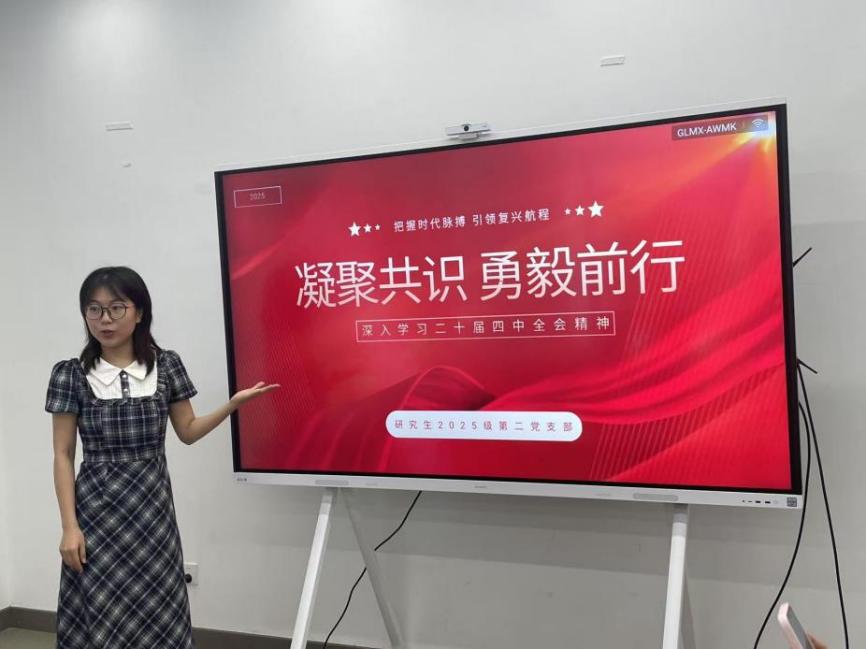 2025级研究生第二党支部聚焦“凝聚共识,勇毅前行”主题开展微党课。党支部书记洪梓轩系统阐述了“十五五”规划建议的核心要义,引导党员既要从宏观层面把握国家发展的战略布局与中国式现代化的时代内涵,也要结合文科学科特色找到个人学术研究与国家发展需要的结合点,推动全会精神落地生根。