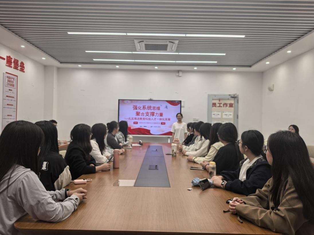 各支部书记围绕《习近平谈治国理政》第五卷及学习贯彻党的二十届四中全会精神开展专题党课。2025级研究生第四党支部围绕“强化系统思维,聚合支撑力量”展开学习,聚焦教育、科技、人才一体化发展。党支部书记熊国双从“明定位、探逻辑、看实践、践担当”四个层面系统阐释了三者深度融合的内在逻辑与实践路径,引导学科语文专业的同学思考如何搭建人文与科技的桥梁。