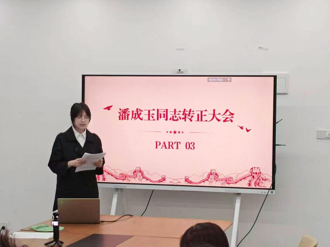 转正大会环节,潘成玉同志宣读转正申请,汇报了在预备期内思想政治、学习科研、支部工作、社会实践等方面的表现与收获,并诚恳剖析自身在理论联系实际、工作创新、性格修养等方面的不足及改进方向。