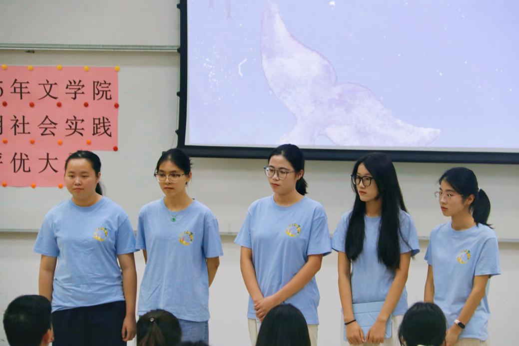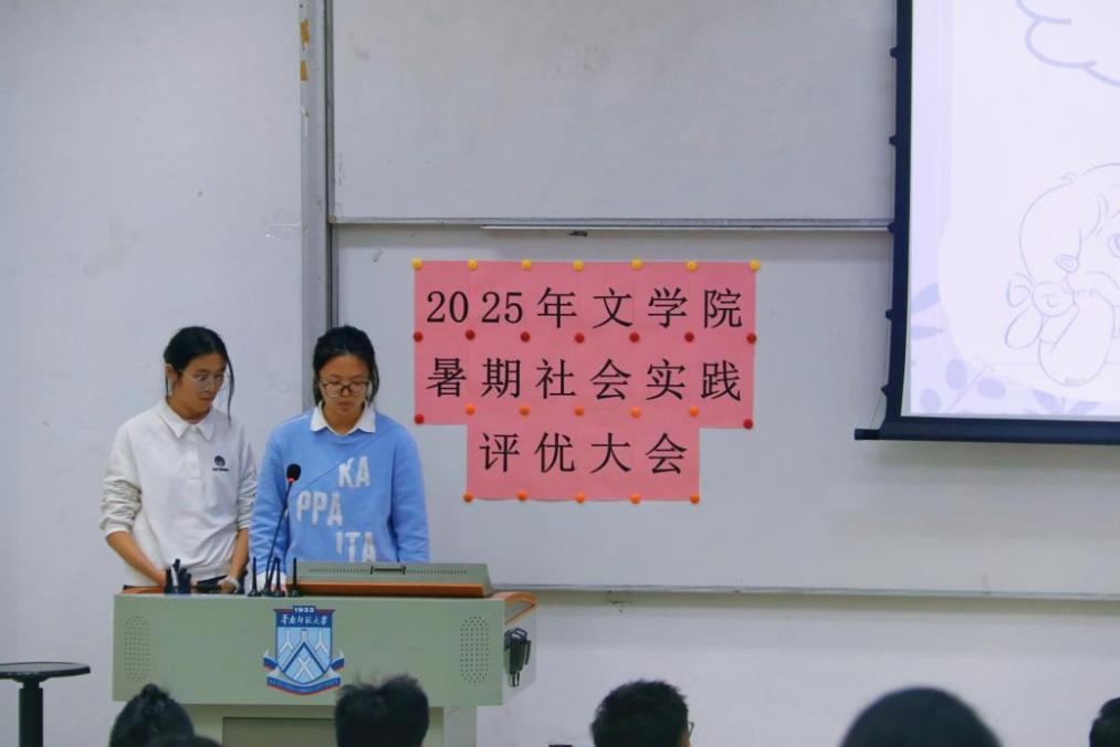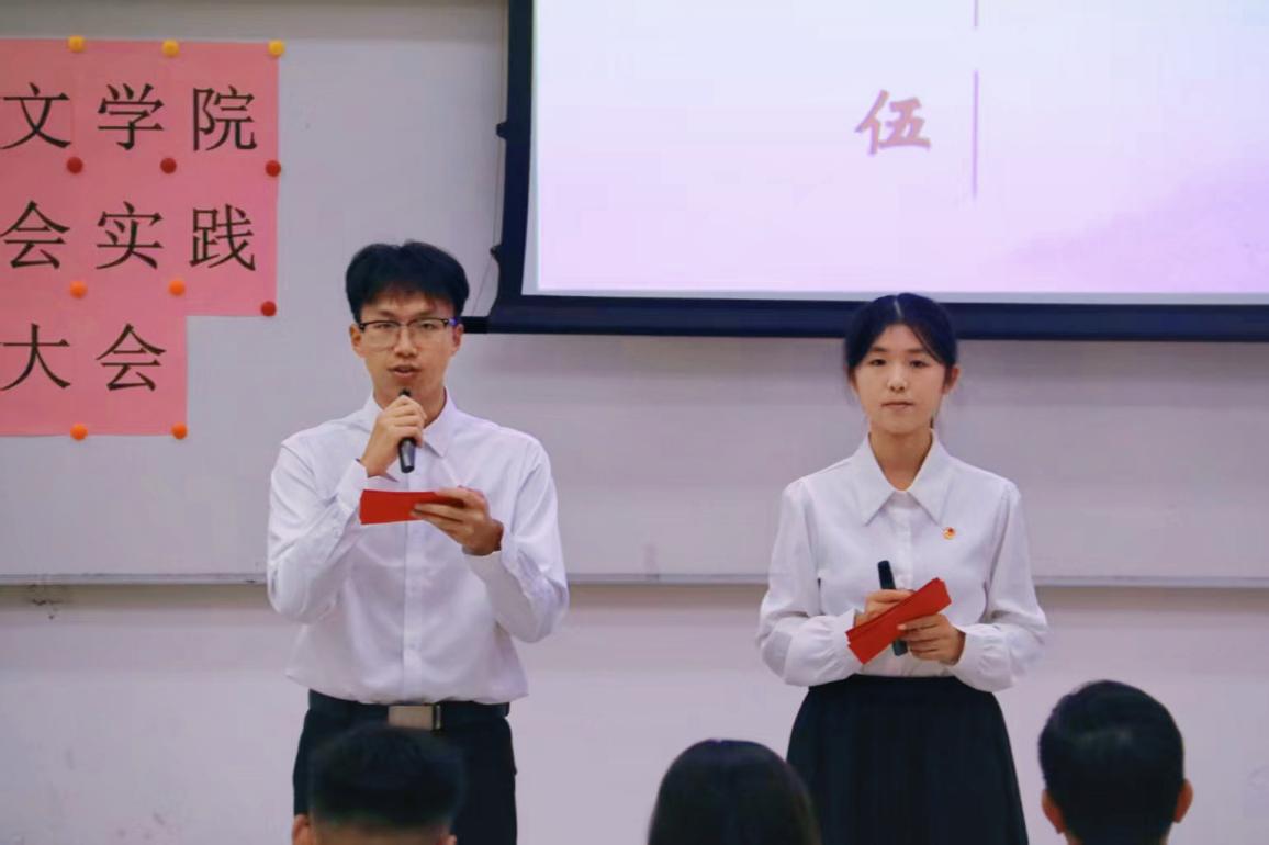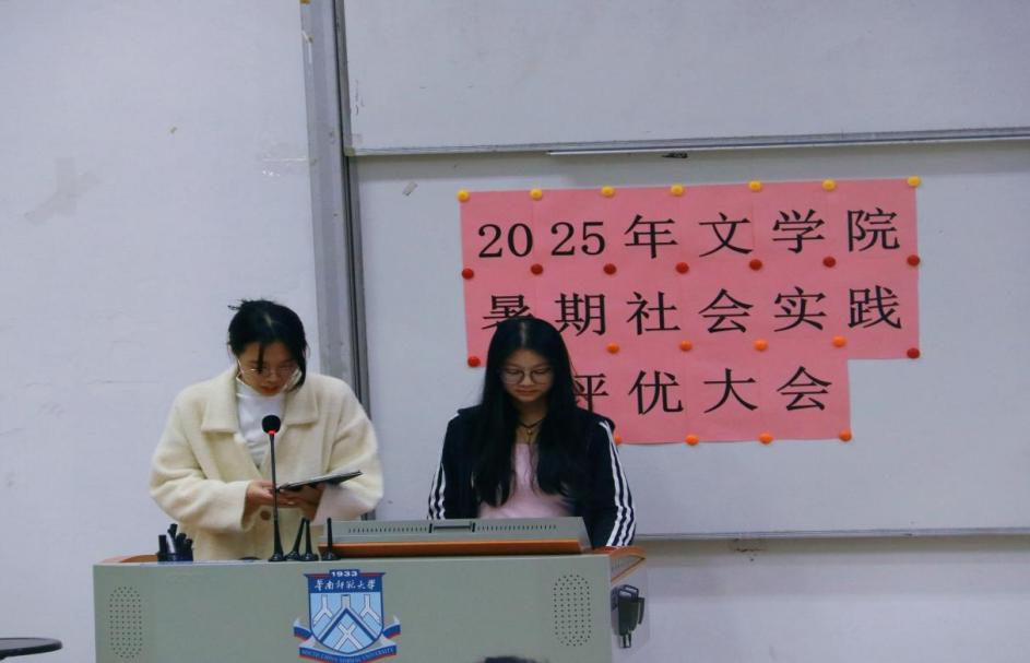 主持人李元浩、黄滢滢同学宣布,2025年文学院暑期社会实践活动评优大会现在开始!