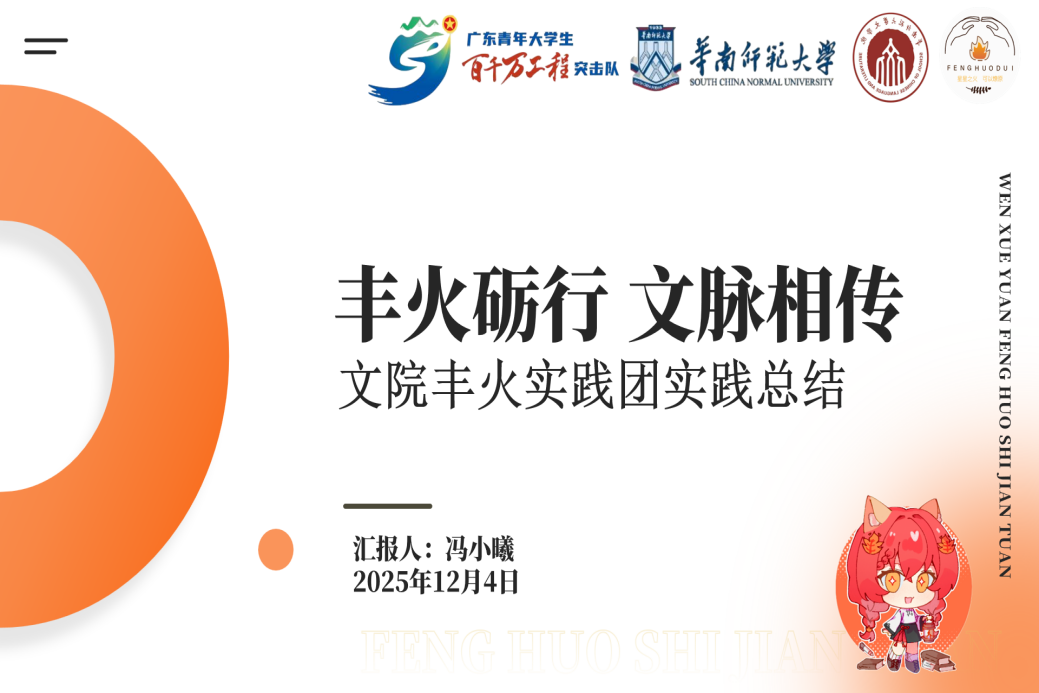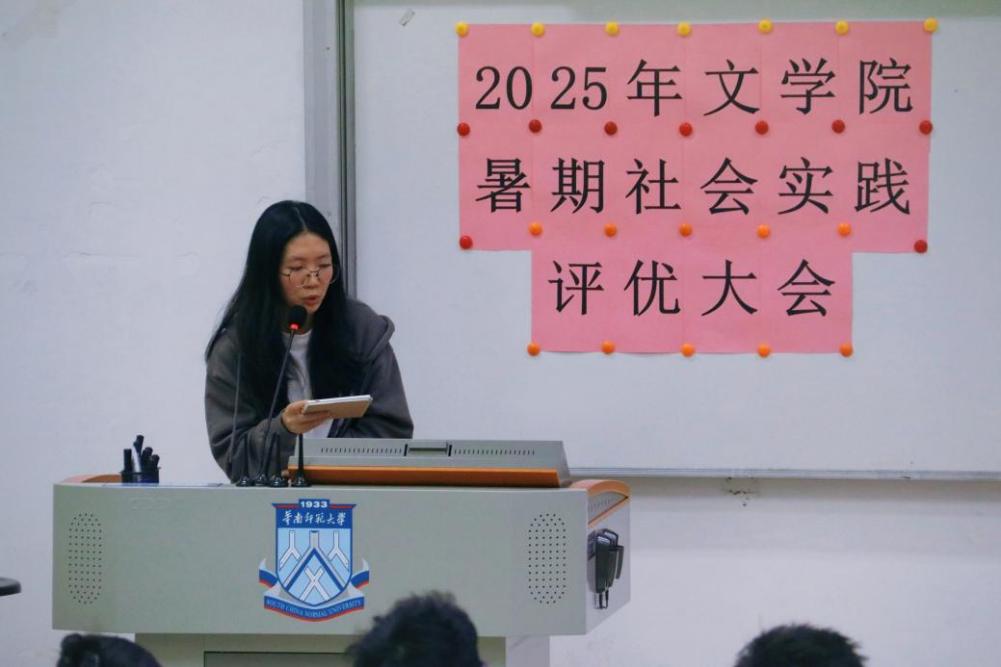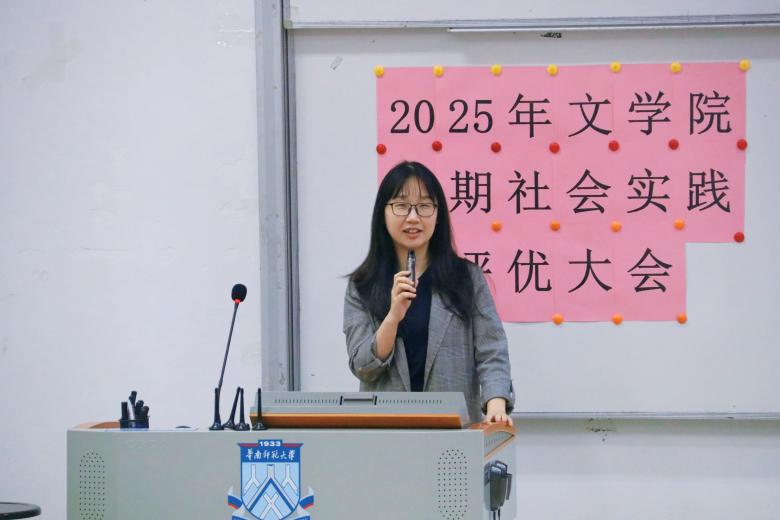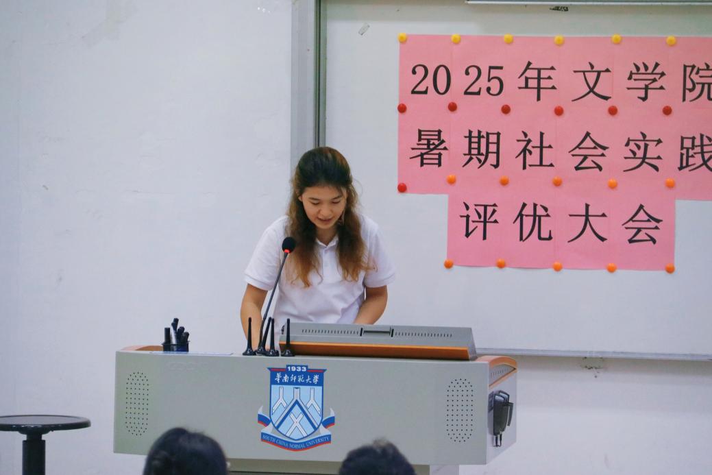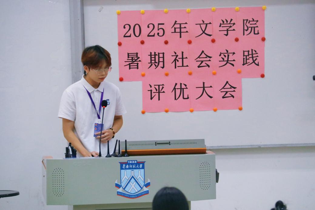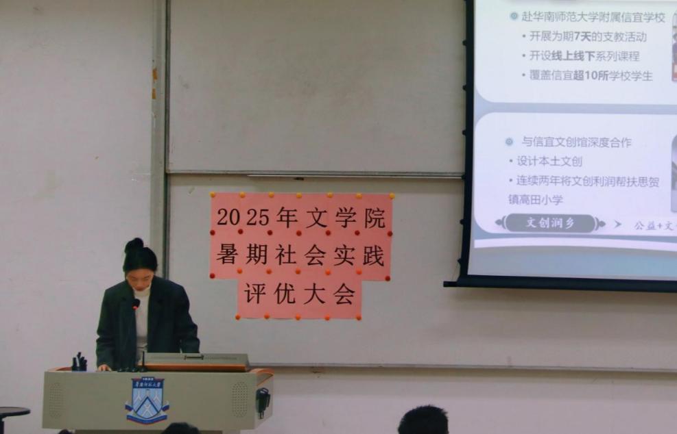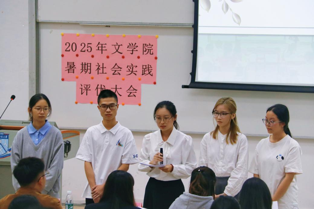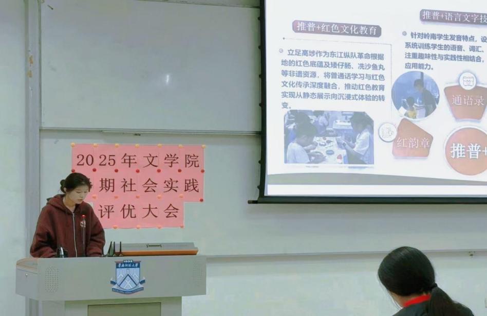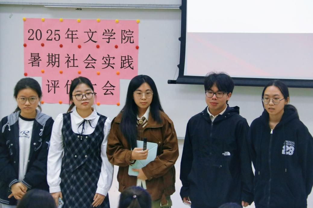 12月4日下午14:30,2025年文学院暑期社会实践活动评优大会在教学楼1栋106教室举行。本次活动分为校级立项队伍成果展示与答辩、校级优秀队伍风采展示两个环节。文学院学生工作负责人许灿荣老师、文学院团委书记苏伟兰老师、音乐学院团委书记谢思洁老师、旅游管理学院团委书记秦宁老师、光电科学与工程学院团委书记周家文老师和各学院实践部部长作为本次评优大会的评委出席本次大会。在大会中,十一支校级立项队伍通过精彩纷呈、绘声绘色的展示与答辩,赢得了现场久久不息的掌声。五支校级优秀队伍则总结展示了实践成果,向我们展示了队伍在实践中的耕耘与收获。下面让我们一起来回顾各队伍的精彩时刻吧!